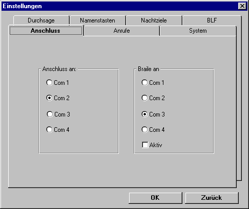 Falls ein Braille-Terminal (Hicom Attendant B Office, nur für bestimmte Länder bzw. Sprachen verfügbar) an dem PC installiert ist, so müssen Sie hier den COM-Port angeben, an dem die Tastatur angeschlossen ist, und die Tastatur über die Option "aktiv" einschalten.