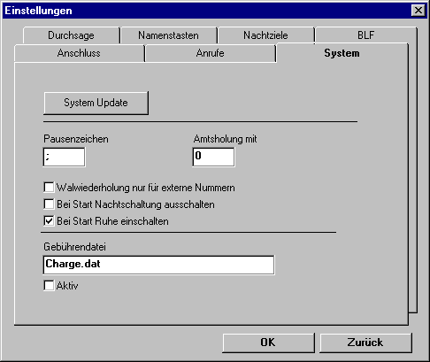 Gebührendatei: In der Gebührendatei werden alle gebührenpflichtigen Telefonate mit ihren Werten abgespeichert. Die Gebühren werden nur dann in der Datei registriert, wenn die Gebührenerfassung vom Systemadministrator in der Anlage eingerichtet ist. Das wird Ihnen dadurch angezeigt, dass die Option "Aktiv" mit einem Häkchen versehen ist. |
