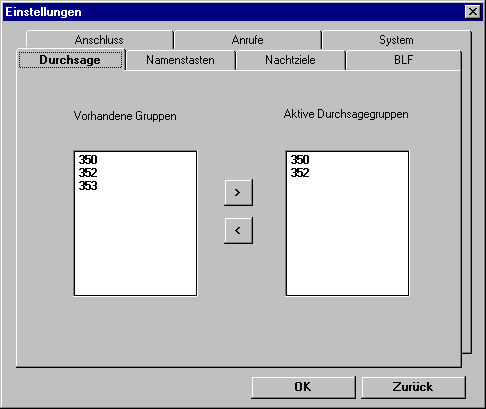 In dem Register "Durchsage" können Sie die in dem Kommunikationssystem vorhandenen Gruppen als aktive Durchsagegruppen einrichten.